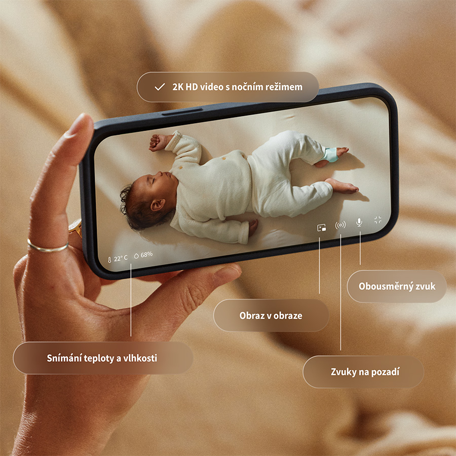 Rozlišením mezi „zvuky“ a „pláčem“ pomáhá kamera Cam 2 rodičům pochopit, zda je miminko jen trochu neklidné, nebo potřebuje pomoc s návratem ke spánku. Stejně jako dospělí, ani miminka nezačnou plakat okamžitě – často vydávají různé zvuky, které nemusí nutně znamenat nepohodlí.