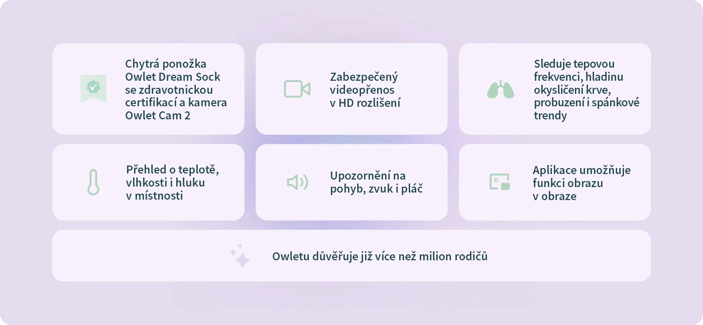 Díky dosud nejpokročilejšímu monitorovacímu systému od společnosti Owlet vidíte, slyšíte a máte pod kontrolou vše podstatné, abyste věděli, že je vaše miminko v pořádku. Chytrá videochůvička Owlet Cam 2TM a první chytrá ponožka se zdravotní certifikací Dream SockTM. Tyto produkty umožňují sledovat tepovou frekvenci, hladinu kyslíku v krvi, spánkový režim dítěte a zobrazit streamované HD video přímo v chytrém telefonu. Můžete se spolehnout, že naše pokročilá technologie nabízí klinicky ověřenou přesnost na lékařské úrovni a upozorní vás prostřednictvím základny i aplikace Owlet Dream, kdykoli se tepová frekvence nebo hladina okysličení krve vašeho děťátka odchýlí od přednastavené normy.
